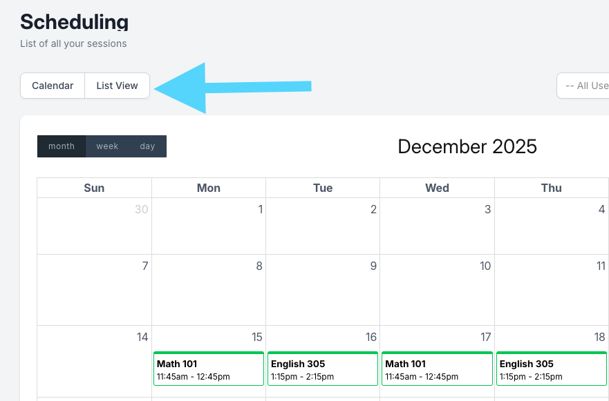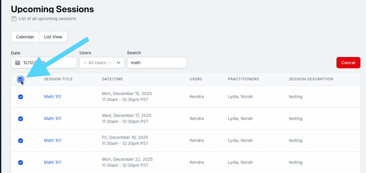 Scroll through the list of sessions and select the circle to the left of each session you want to cancel 🔵