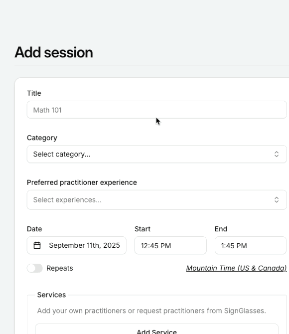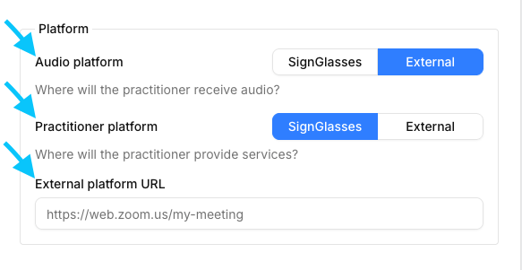 Under Platform, select whether the SignGlasses platform or an external platform (ie: Zoom, Google Meets, Microsoft Teams, etc.) will be used in this session.