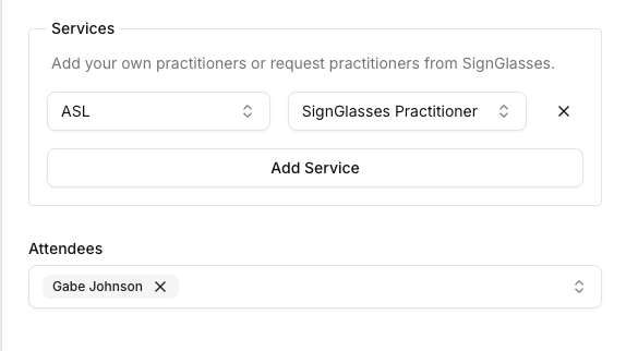 Under Attendees select your name and the name(s) of anyone else who needs to log in to SignGlasses for the session.